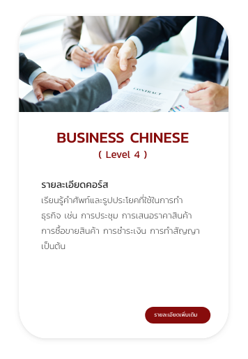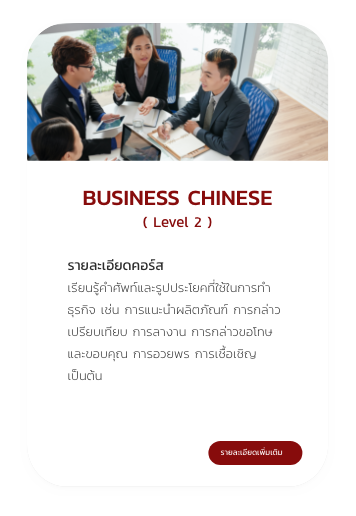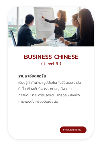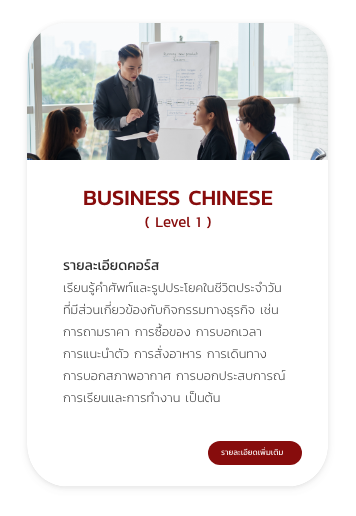 คอร์สเรียนภาษาจีนเพื่อการติดต่อสื่อสารเชิงธุรกิจ เหมาะสำหรับผู้ที่ต้องการใช้ภาษาจีนในการทำงานและทำธุรกิจกับชาวจีน เน้นการนำไปใช้ได้จริงทั้งทักษะฟัง พูด อ่าน เขียน โดยแต่ละบทเรียนจะมีคำศัพท์และสถานการณ์ที่พบในที่ทำงานและเกี่ยวข้องกับการติดต่อเจรจาทางธุรกิจ คอร์สเรียนนี้แบ่งเป็น 4 Level ตามความยากง่ายและเนื้อหาของแต่ละบทเรียน